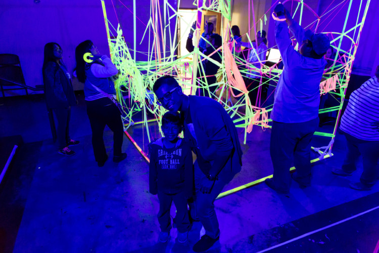 We collaboratively constructed a giant, glowing wood and woven plastic sculpture inspired by adjunct instructor Katie Pell. We also had a blast throwing luminescent clay on the potter’s wheel, or working it into fantastical animals, and glowing clay figures under the instruction of Paul Northway, Diana Kersey, and studio technician Allysha Farmer.