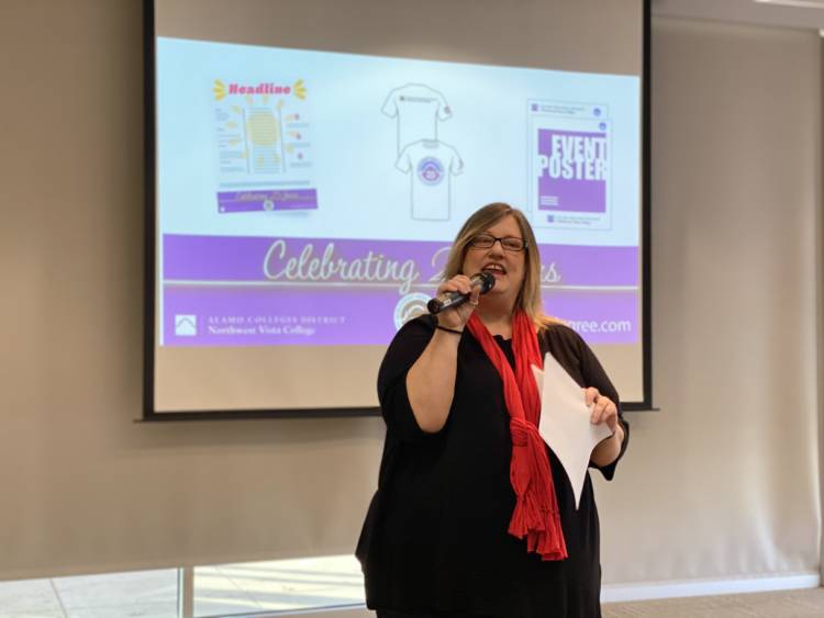 Lisa McGoldrick of NVC President’s Office discussed the year-long celebration for the Alamo Colleges District 75thAnniversary, including the special logo, scholarship fundraising, and collaborative celebratory and academic events to be held on campus.