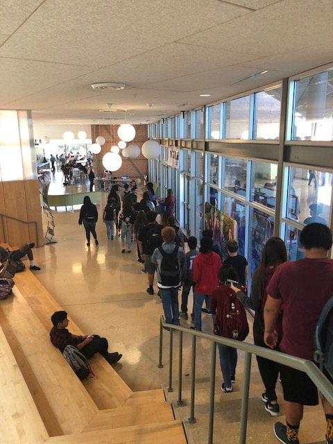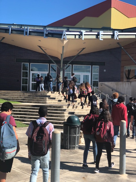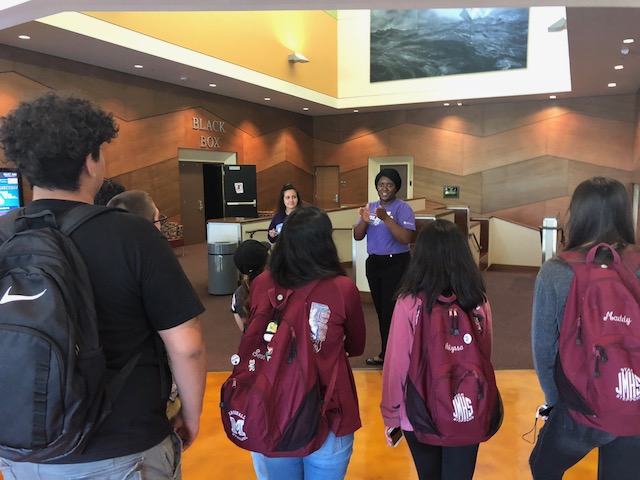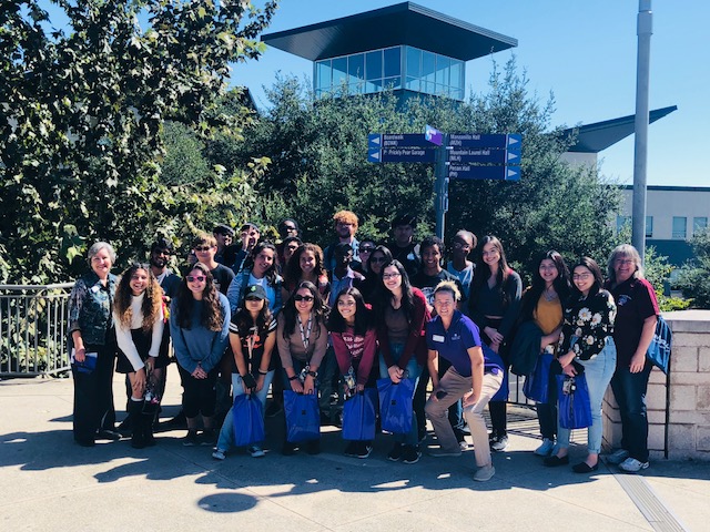 Northwest Vista College employees lead a group of Dual Credit senior students from Marshall High School on a campus tour.